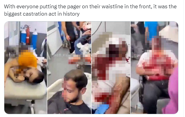 The most amazing international news of the week. On Tuesday (9/17): Hezbollah Pagers Explode Across Lebanon, Causing Thousands Of Injuries. Mossad rigged thousands of pagers used by Hezbollah terrorists to explode simultaneously.  Result:  5000 injured; 500 critically injured; 500 blinded; 300 without ears; 1500 castrated.