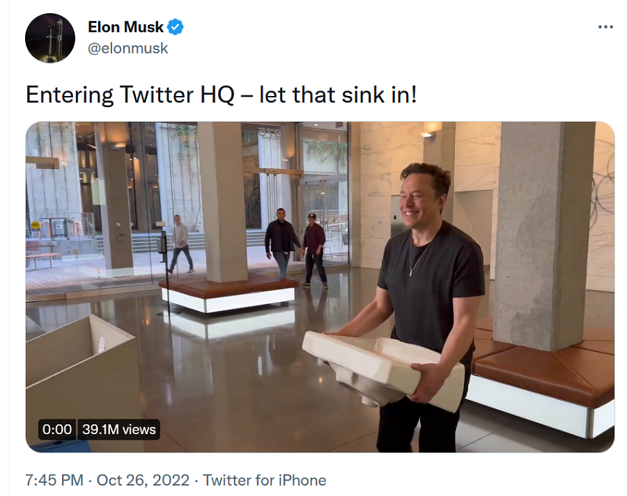 On Wednesday evening (10/26), Elon posted a video of himself marching into Twitter’s San Francisco headquarters physically carrying an actual kitchen sink, then posting: Let that sink in.