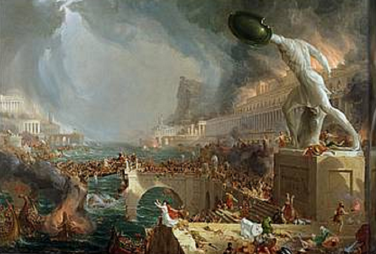 Ironically, the virtues of an early republic—hard work, honesty, courage, frugality, morality—lead to the great wealth and power which then contribute to its decline.