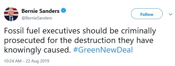 In case you missed it, or are exclusively a reader of the New York Times, late last week Bernie Sanders tweeted this nugget: "Fossil fuel executives should be criminally prosecuted for the destruction they have knowingly caused."