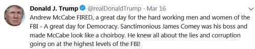 Late Friday night (3/16), after the long overdue firing of Andrew McCabe, the disgraced former acting FBI director, the president tweeted to the American people that McCabe’s termination (and possible loss of pension) marks a “great day for the hard working men and women of the FBI – A great day for Democracy.”