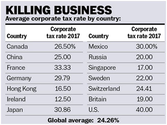How much should corporations pay in taxes? The table shows average corporate tax rates by country. You will notice that the United States has by far the highest tax rate.