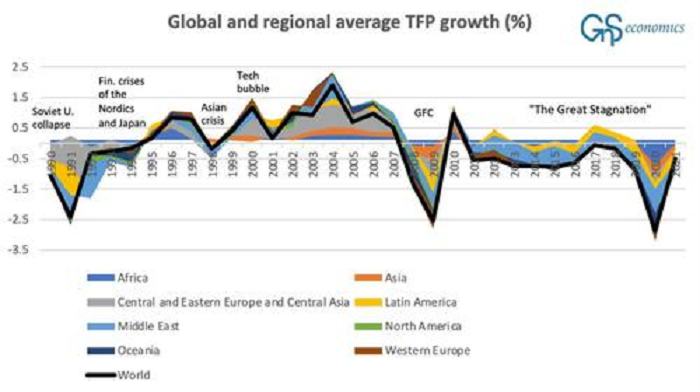 More for investors; how many years of surpassed interest rates and endless bailouts have lead to malinvestments that have not been cleared by the normal process of bankruptcies, resulting in the Great Stagnation of productivity: