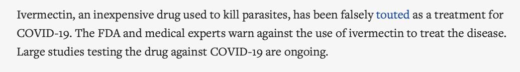“Falsely touted as a treatment for Covid-19?” That’s about as maliciously dishonest as you can get, since it will contribute to killing people whose lives would otherwise be saved by the Ivermectin protocol — which has been shown to be safe and effective in the clinical setting around the world.